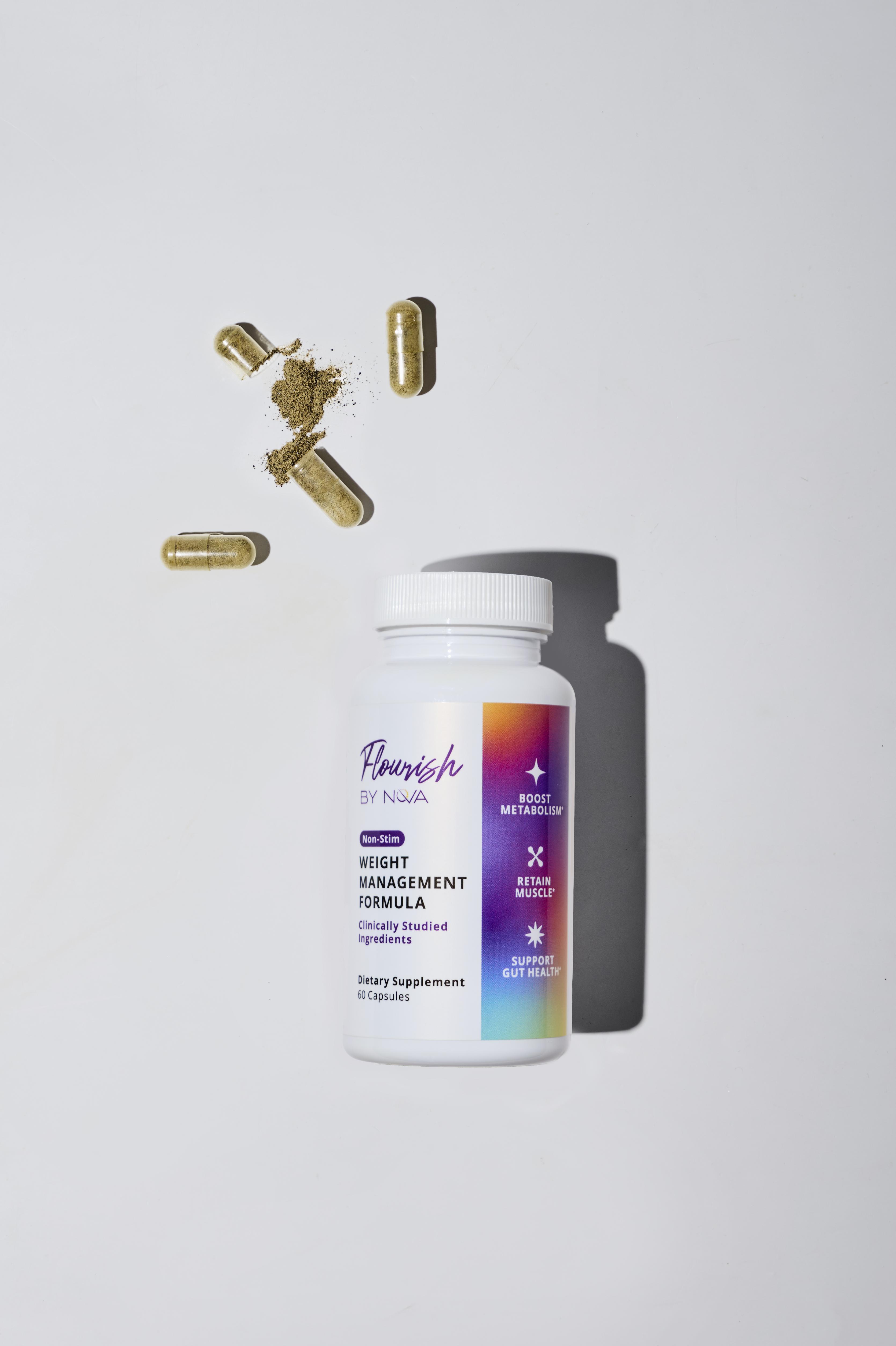 Flourish is a once-daily supplement designed to support metabolism, gut health, and weight management — without prescriptions, stimulants, or diet culture.* It’s made with clinically studied ingredients that work with your body to support digestion, satiety, and daily balance.*